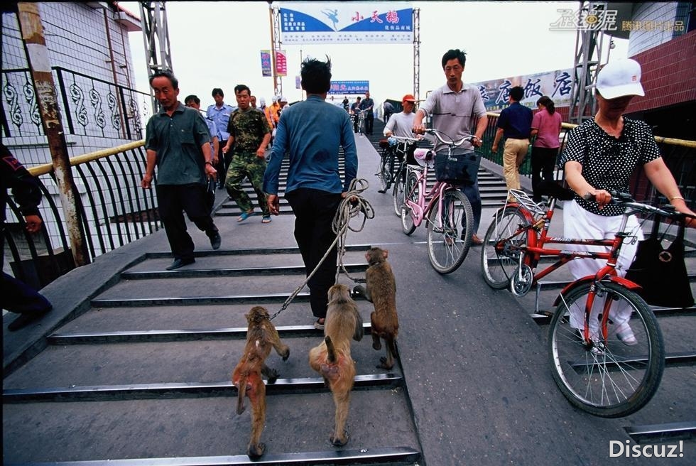 【社会历史】老杨牵着猴子行走在热闹的城市街道。