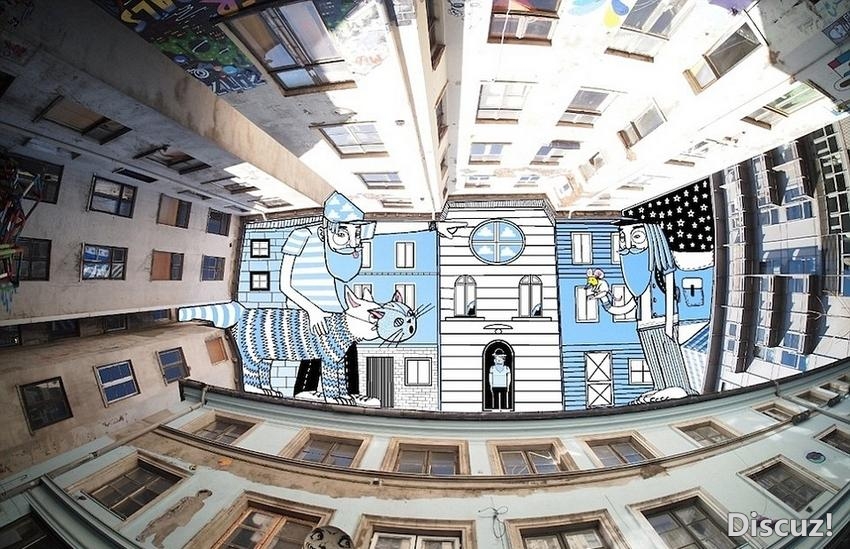 【当代艺术】他以蓝天为画布,周围建筑为框架,以充满趣味的线条,创造出一系列栩栩如生的搞怪人物,比如挥舞电吉他的摇滚巨星、婀娜性感的美女等。