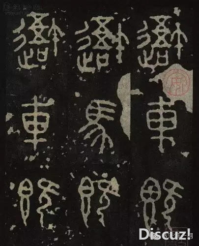 石鼓文无疑脱胎于金文,但已跳出了金文的窠臼。在书写形式上,既无金文字形之大小多变,又无点画之粗细悬殊。其点画粗细均匀,有一种圆笔曲线之美,笔画婉转曲折,灵活生动;其结体方正均衡,疏密多变,体势舒展,落落大方。继承、保留了金文的韵律之美,实开小篆整饬风貌之先河。但石鼓文又以其雄浑古朴的气韵,洒脱疏落的结体,而克服了小篆拘谨、纤弱之病,真可谓一代书法之典范、承前启后之艺术瑰宝。 |