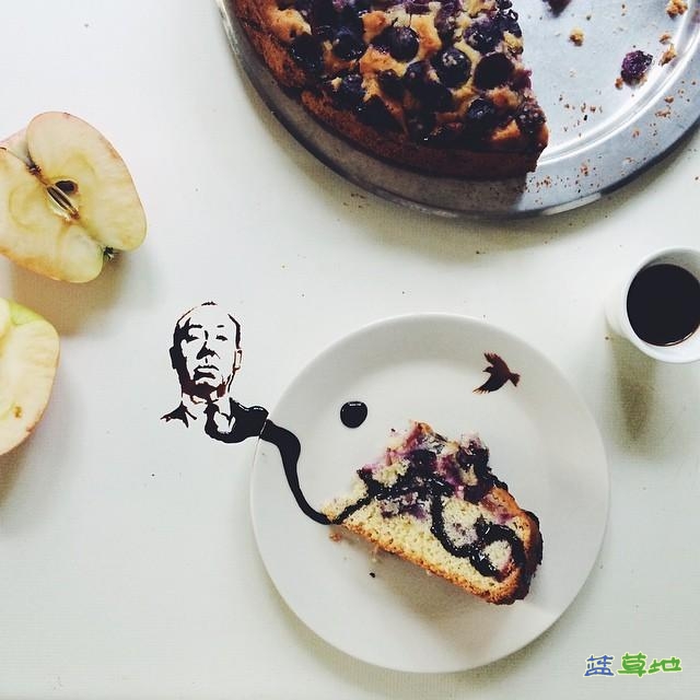 用巧克力酱画成的艺术家头像,配上可口的蓝莓吐司面包,是不是更有食欲了呢?
