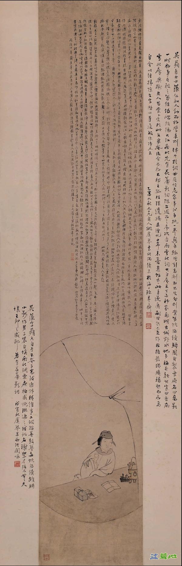 浙江省博物馆藏清代异装癖女词人肖像《吴藻小影》 数量上稍多一些的是广义的同性恋题材作品,即以隐喻而非直写的方式表现同性恋人物。清初诗坛领袖王士禛(1634-1711)的学生崔华(字不凋,娄东秀才,工花鸟画)为陈维崧(1625-1682)作纨扇花鸟画《小青飞燕图》,花名“小青”,盛开九朵,比拟陈的男性情人徐紫云之字“九青”,一春燕斜飞其上,以拟其身姿。可惜此图已不存,它以花鸟画象征同性恋人物,寓意幽微曲折,端赖陈维崧的社会地位与广泛交游,才留下相关文献,让我们一窥究竟。还有一些人物肖像,虽然无法确认像主是否同性恋人物,但是外貌、衣着与常人有异,似乎在印证其同性恋者身份,也应归入广义作品之列。如金农《幼僧图》(日本京都有邻馆藏)所画幼僧的相貌和衣着颜色颇为鲜妍诱人,与寻常僧人不同,其中可能寄托着金农的性取向。更为引人注目的是一位清代有易装癖的女词人吴藻(1799前后-1856/1862前后,字苹香,号玉岑子,浙江仁和【今杭州】人,原籍安徽黟县)的肖像。《吴藻小影》(浙江省博物馆藏)作于像主去世以后(同治十年,1871),按照西方的肖像画标准(像主在世时对着真人写生而成)来说,应该算历史人物肖像。画中是一男装女子正饮酒读书,作者自题为《吴萍香饮酒读骚图》。