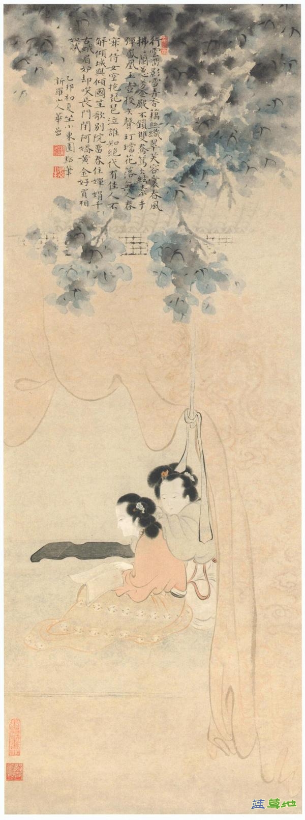 清代华喦《怀琴春怨图》 琴这种道具还在另外两件仕女作品中出现。一是华喦(1862-1756)《怀琴春怨图》轴中,画上是一个闺怨场景,题诗是元人萨都剌的诗《题二宫人琴壶图》,诗境平庸,其中提到不少道具,但华喦只画了琴,表达出主题的转移,无聊长日中的宫怨变成了两个女子因长期的闭锁生活而被迫产生的相互依恋。