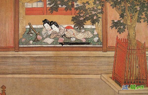 明代仇英《汉宫春晓图》 仇英(1482-1559)《汉宫春晓图》卷中段后室内,绘有两名女子俯卧在地席上共读的场景,地席上也有一张琴。虽然窗户洞开以便观众能够看到她们,但从空间设置来说,她们所处的是一个相对私密的环境,琴和后面的书架都在暗示这是一个书房。其中一位女子手中团扇上的图画似乎是萱草(宜男草),表明她们仍然渴望男子的宠幸和生育,与同性的亲近不过是无奈的替代。唯一专指女同性恋的典故“对食”正是出自西汉后宫,这个场景很可能表现的就是“汉宫”的“对食”之风。