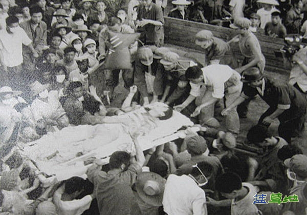 【社会历史】解放军和医务人员抢救出在开滦总医院楼下一名被埋八天七夜的矿工。