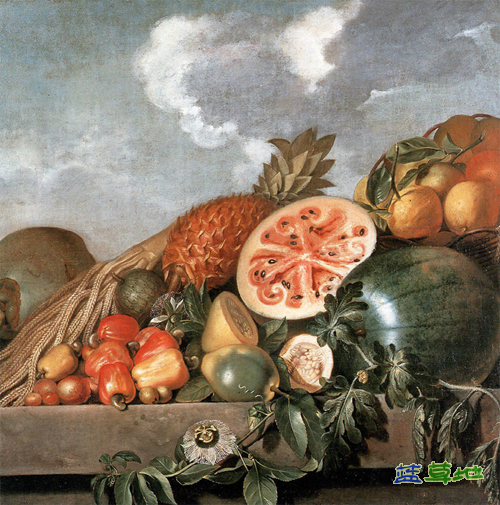 【文化典藏】切开的西瓜乍一看像是放大的石榴,被分成几个部分,而红色的瓤和瓜籽都在小隔间里面。图为Giovan Battista Ruoppolo所绘的“静物水果”布面油画(创作于17世纪)。