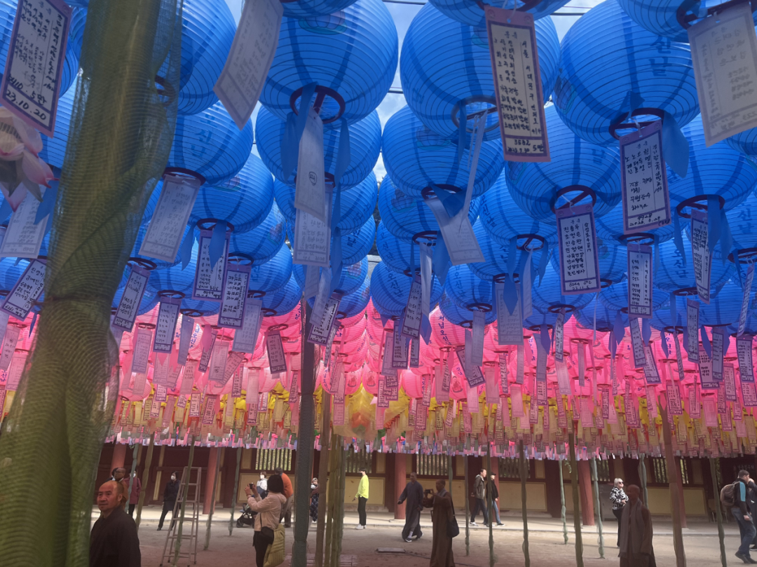 那一刻,在阳光下的大殿也很美。韩国的大殿特别漂亮,各种彩绘颜色搭配得很有味道。房檐下,风铃传出的声音,我们诵经的声音,三个国家的佛教徒站在大殿前,感觉那一刻是真的被这铃声所打动。这童年般的声音,就像天真的孩童,很纯粹,很纯净。天地之间,朗朗乾坤之下,我更加祈愿这个世界,这个众生,这个人心,都是慈悲的,都是相合的。让我们远离暴力,远离战火,祈愿和平,山河无恙,民众安居乐业。愿所有的众生,无身体的痛苦,无精神的痛苦,愿他们保持快乐。