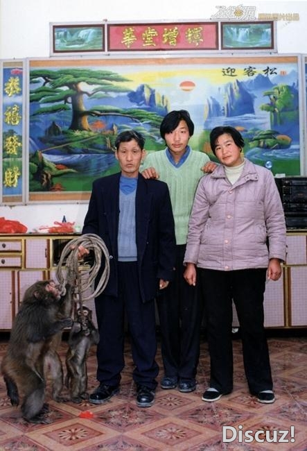 【社会历史】耍猴人杨贵林家人和他们的三只猴子。