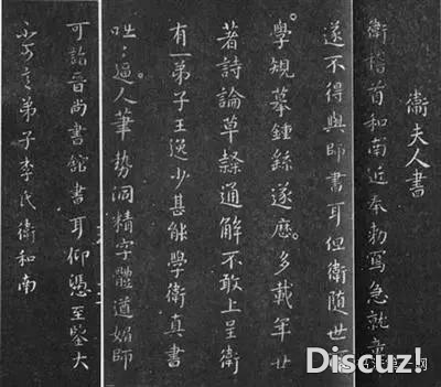 王羲之的老师卫夫人就有《笔阵图》,其中说横“如千里阵云,隐隐然其实有形”;点“如高峰坠石,磕磕然实如崩也”;撇如“陆断犀象”;捺如“百钧弩发”;竖如“万岁枯藤”等。孙过庭《书谱》中也说到作书要“观夫悬针垂露之异,奔雷坠石之奇,鸿飞兽骇之资,鸾舞蛇惊之态,绝岸颓峰之势,临危据槁之形;或重若崩云,或轻如蝉翼;导之则泉注,顿之则山安;纤纤乎似初月之出天崖,落落乎犹众星之列河汉;同自然之妙有,非力运之能成;信可谓智巧兼优,心手双畅,翰不虚动,下必有由。一画之间,变起伏于峰杪;一点之内,殊衄挫于毫芒”。图为卫夫人书法。 |