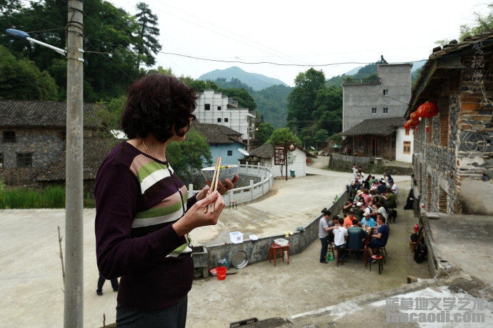 【社会历史】距我们流水席不远的房顶上,一位大姐端着饭碗边吃边看着这些村里来的客人。
