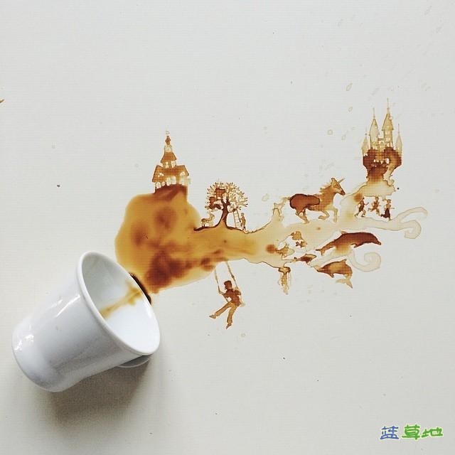 咖啡泼洒出人与自然和谐相处的美景图,很像中国传统艺术中的水墨画。