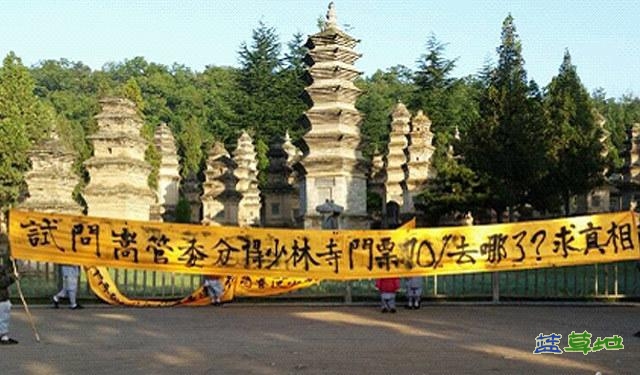 资料图:着僧服人士在少林寺拉横幅,质疑门票收入用途。