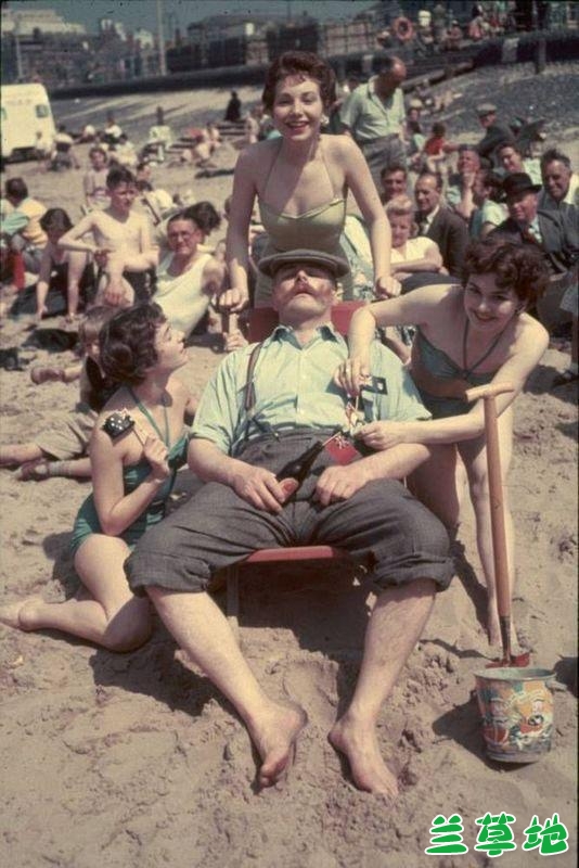 【社会历史】照片中有一名男子悠闲地在躺椅上小憩,身边围着当年参加选美比赛的众多美女。