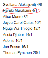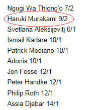 2013年诺贝尔文学奖赔率榜,村上春树(英文写法Haruki Murakami)第二