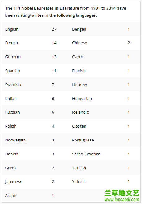小编在上一篇预测贴中,把中文、俄语、阿拉伯语列为了诺贝尔文学奖里的“小语种”,被一些网友质疑。其实,按照往届得奖者所操语言来看,这几种语言真的都是小语种,跟英、法、德语没得比,甚至俄语还比不上瑞典语。中文和阿拉伯语加在一起,比不上波兰语。