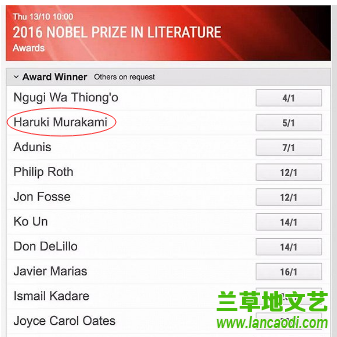 2016年诺贝尔文学奖赔率榜,村上春树……