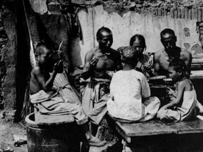 清末,还在慈禧的控制下。慈禧还在过着奢侈的生活,清政府在当时腐败无能,而且入不敷出,人民一贫如洗。照片中是人们吃饭的场景,人们衣服破烂不堪,屋子可能要随时倒塌!