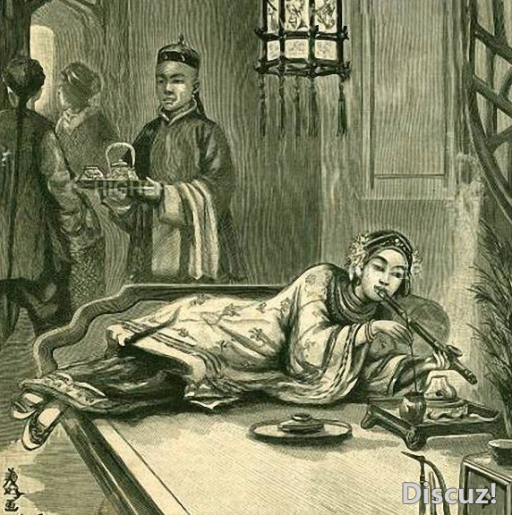 有钱人吸食鸦片的“身姿”,妇女穷的身上只披一块布