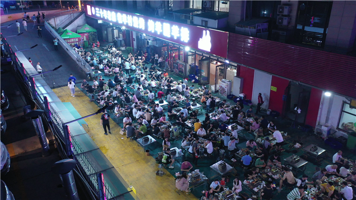 走出“小树林”,被一阵嘹亮的歌声吸引了过去。一群年长的阿姨们正在另一个烧烤摊前聚餐。墙上拉着红底白字横幅,“淄博市老年合唱团”。老人们吃着烤串,有的跳舞,有的唱歌,还有的在喝酒。整个街道上空被她们这群乐观、积极、向上老人的美好气氛晕染着。当我们走近她们拿出手机拍视频时,她们热情地给我们递过两串肉,并大声说:“淄博人民欢迎外地来的朋友,我们把最真挚的歌声送给你们。”他们在镜头下一点儿都不做作,一点儿都不腼腆,一点儿也不小气。我们俩在不经意间再一次感受到了淄博人的热情。我和同伴开玩笑:“早知道能蹭吃蹭喝,就不专门花钱了,等一会儿,我负责拍段子,你负责要的吃哈……”