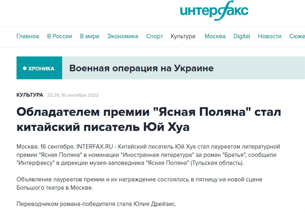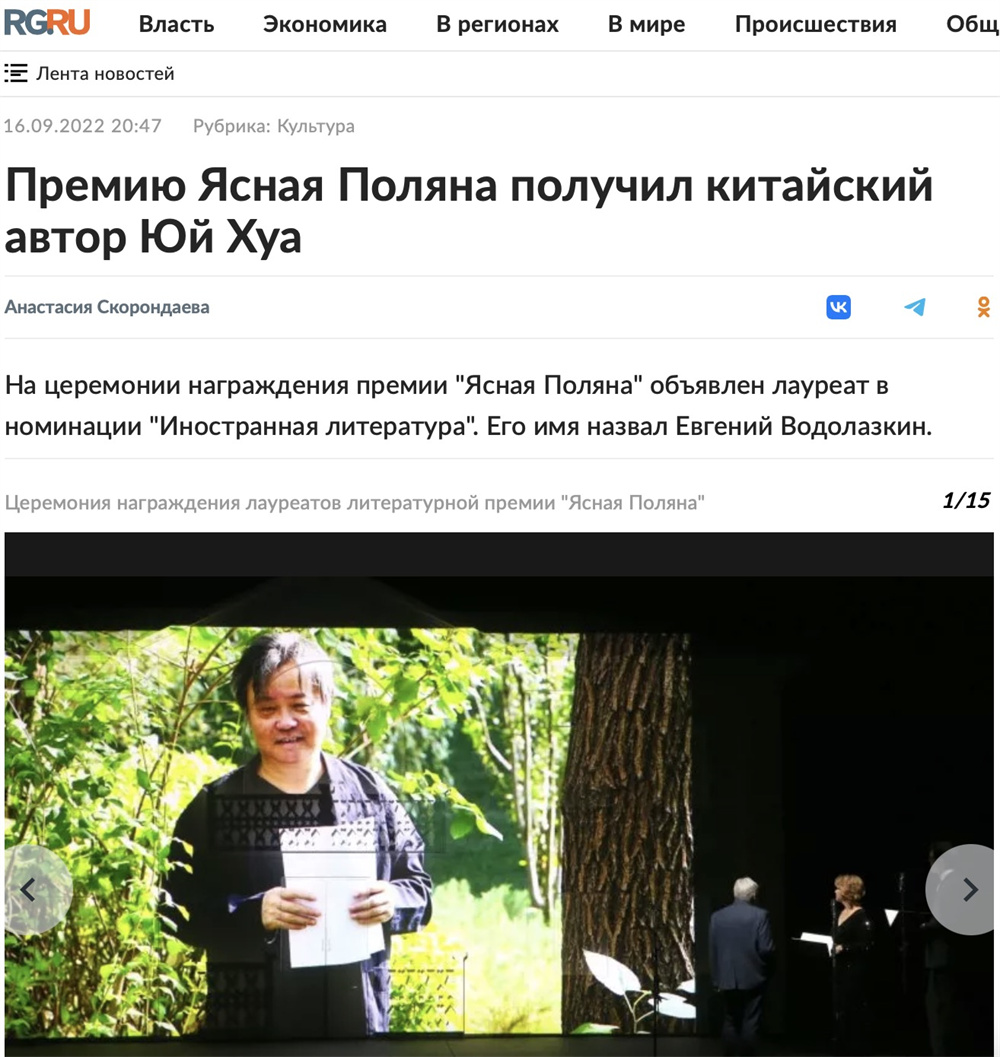 莫斯科时间9月16日晚(北京时间9月17日凌晨),第20届“亚斯纳亚·波利亚纳文学奖”颁奖典礼在莫斯科大彼得罗夫大剧院举行。“亚斯纳亚·波利亚纳文学奖”是当今俄罗斯文学界最负盛名的奖项之一,中国作家余华凭借长篇小说《兄弟》获得了今年“亚斯纳亚·波利亚纳文学奖”的最佳外语作品奖。