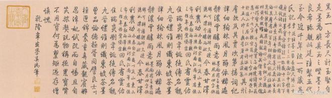 缂丝书法是指以纯文字作品为粉本的缂丝作品,一般以摹缂佛经、名人名家的书法作品为主。宋代的缂丝书法作品,据《石渠宝笈》著录,有《米芾临帖卷》《米芾书唐诗卷》《司马光家训轴》和《朱熹书七言诗轴》等,这些作品与缂丝绘画相比,数量极少,且篇幅都不大,一般为十几字至几十字。这样的情况一直延续至元、明时期。《秘殿珠林》及《石渠宝笈》著录的宋元明时期缂丝作品共106件,其中书法作品仅13件。究其原因,是因为缂丝技法的最大长处在于“通经断纬”。用缂丝工艺来织作色彩丰富多变的绘画作品,能够最大程度地用其所长。从流传至今的缂丝作品中也可以看到,缂丝画的题材大多选取工笔花鸟、山水一类适宜用缂丝技法表现的作品。而书法作品色调单一,笔势多变,又多竖笔,缂丝工艺的长处无从显现。因此用缂丝织作书法作品,在历史上并不常见。但这种局面在清高宗时期发生了转变,出现了一大批缂丝书法长卷,这与乾隆皇帝本人的爱好是密切相关的。现存乾隆御笔缂丝书法,多是在素地上用黑或蓝色丝线缂字,以行书为主,笔法温润遒劲,缂织精致细密。