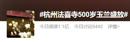 今天是 " 三八 " 妇女节,一大早 " 杭州法喜寺 500 岁玉兰盛放 " 冲上了微博热搜,截至当日晚上 8 时 39 分,该话题阅读量已超过 1.1 亿,评论数达 5442 次↓↓↓