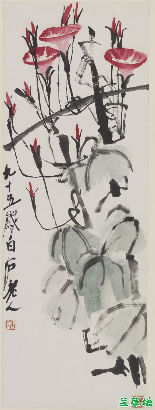 1919年齐白石移居北京,因结交陈师曾并在其启发下取法吴昌硕,而一洗八大冷峻一路画风,并以"妙在似与不似之间"的造型规律、"平正见奇"的构成法则、工与泼的交互相谐以及重墨与浓彩并置之设计,创造了极具个性的"红花墨叶派"写意画风。